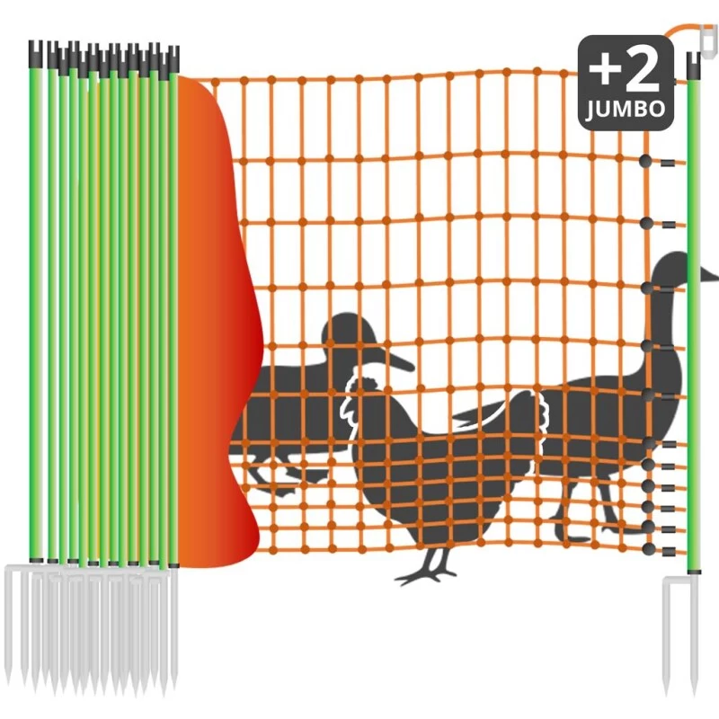 Das Geflügelnetz »Euronetz« Geflügelschutznetz sind 50m lang, haben 2 Spitzen, und sind 112cm hoch. Die gewohnte Euro-Netz Qualität können Sie jetzt auch mit 19mm starken Doppelspitze-Pfählen (am Anfang und am Ende) beziehen. Das Netz erreicht dadurch eine noch bessere Standfestigkeit und lässt sich optimal spannen. 12 horizontale Kunststofflitzen davon 11 mit eingearbeitetem Chromnickeldraht verwandeln das Geflügelschutznetz in einen Elektrozaun. 15 Pfähle mit Doppelspitze. Euro-Netze sind flexibel, da Unebenheiten mit extra Pfählen und Heringen ausgeglichen werden können. Bodenlitze verstärkt, 32 Kunststoffmonofile Ø 0,40mm, nicht stromführend. Restliche Litzen je 15 Kunststoffmonofile Ø 0,40mm, 3 Edelstahldrähte Ø 0,20mm. Die Senkrechten je 15 Kunststoffmonofile Ø 0,40 mm. UV-stabilisiert. Jeder Maschenkreuzungspunkt vom Geflügelschutznetz ist mit Kunststoffplomben unlösbar verschweißt.
