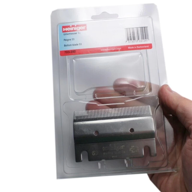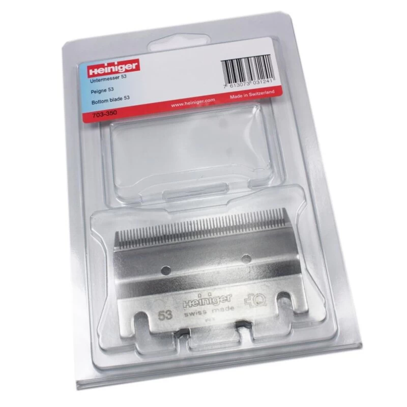 Heiniger 703-350 Untermesser 53 Zähne. Heiniger Schermesser für die professionelle Schur. Aus Spezialstahl gefertigte Schermesser mit langer Haltbarkeit. Mehrmaliges Nachschleifen ist mit den Schermessern möglich.
