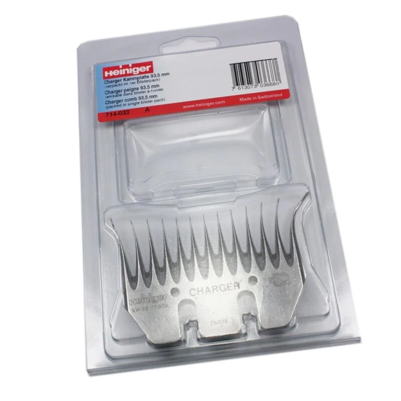 Heiniger Charger 714-033 Schermesser 93,5mm. Heiniger Schermesser für Schafe mit offener Wolle. Speziell entwickelt für Europa und Neuseeland. Aus Spezialstahl gefertigte Schermesser mit langer Haltbarkeit. Mehrmaliges Nachschleifen ist mit den Schermessern möglich.