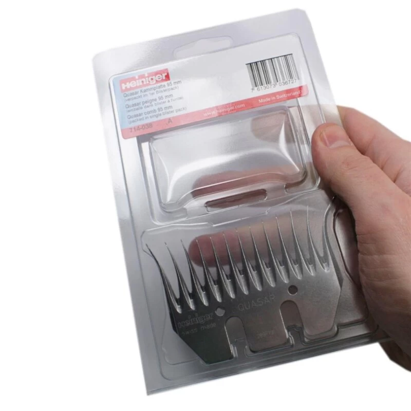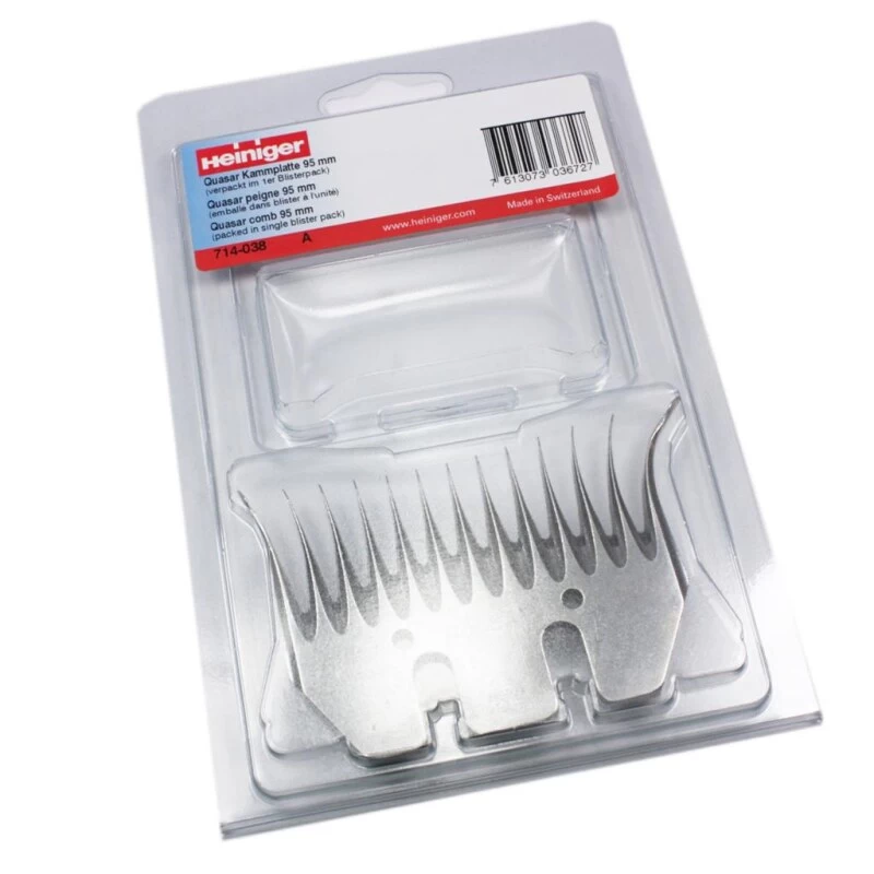 Heiniger Quasar 714-038 Schermesser 95mm. Für PROFI Scherer mit offener Wolle produzierte Heiniger Schermesser. Hohe Ausbeute in offener, kämmbarer Wolle. Die aus Spezialstahl gefertigten Schermesser haben eine lange Haltbarkeit. Nachschliff ist mit diesen Schermessern deshalb mehrmals möglich.