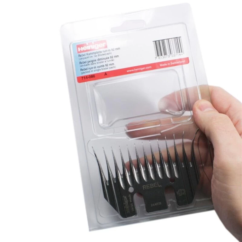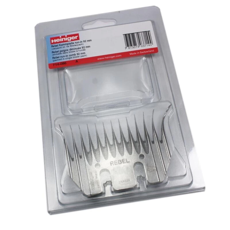 Heiniger Rebel 714-086 Schermesser run-in 92mm. Heiniger Schermesser für die professionelle feine Schur. Scherkamm für feine Wolle. Mit der neusten LG2 Technologie ausgestattet. Gerader Führungszahn mit harmonischer Biegung zu den Zahnspitzen. Aus Spezialstahl gefertigte Schermesser mit langer Haltbarkeit. Mehrmaliges Nachschleifen ist mit den Schermessern möglich.