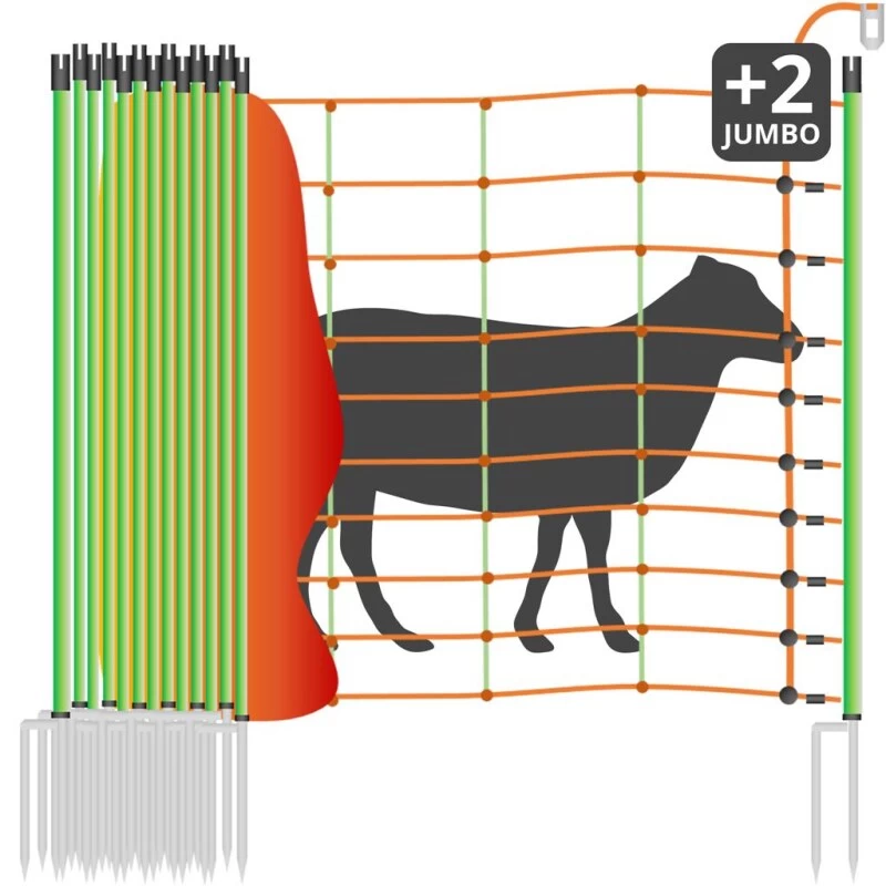 Der Schafzaun »Euronetz« Elektrozaun ist 50m lang, hat 2 Spitzen und ist 106cm hoch. Die gewohnte Euro-Netz Qualität können Sie jetzt auch mit 19mm starken Doppelspitze-Pfählen (am Anfang und am Ende) beziehen. Das Netz erreicht dadurch eine noch bessere Standfestigkeit und lässt sich optimal spannen. KOMBI – mit den starren Senkrechten, 105 cm hoch, 50 m lang. 10 horizontale Kunststofflitzen, davon 9 mit eingearbeitetem Chromnickeldraht machen das Schutznetz zum Elektrozaun. Abstände der Litzen horizontal 6 x 10 cm, 3 x 15 cm sowie alle 30 cm in den Senkrechten – jeweils 14 Pfähle mit Doppelspitze. EINSATZBEREICH: Schafe, Lämmer, Ziegen. Obere Litze um 80% verstärkt, 24 Kunststoffmonofile Ø 0,40mm, 6 Edelstahldrähte Ø 0,20mm. Bodenlitze verstärkt, nicht stromführend. 32 Kunststoffmonofile Ø 0,40mm. Restliche Litzen je 15 Kunststoffmonofile Ø 0,40mm, 3 Edelstahldrähte Ø 0,20mm. UV-stabilisiert. Jeder Maschenkreuzungspunkt mit Kunststoffplombe unlösbar verschweißt. Standfest auch bei hügeligem Gelände oder Bodenunebenheiten. Durch die starren Senkrechten kein durchhängen der Netze