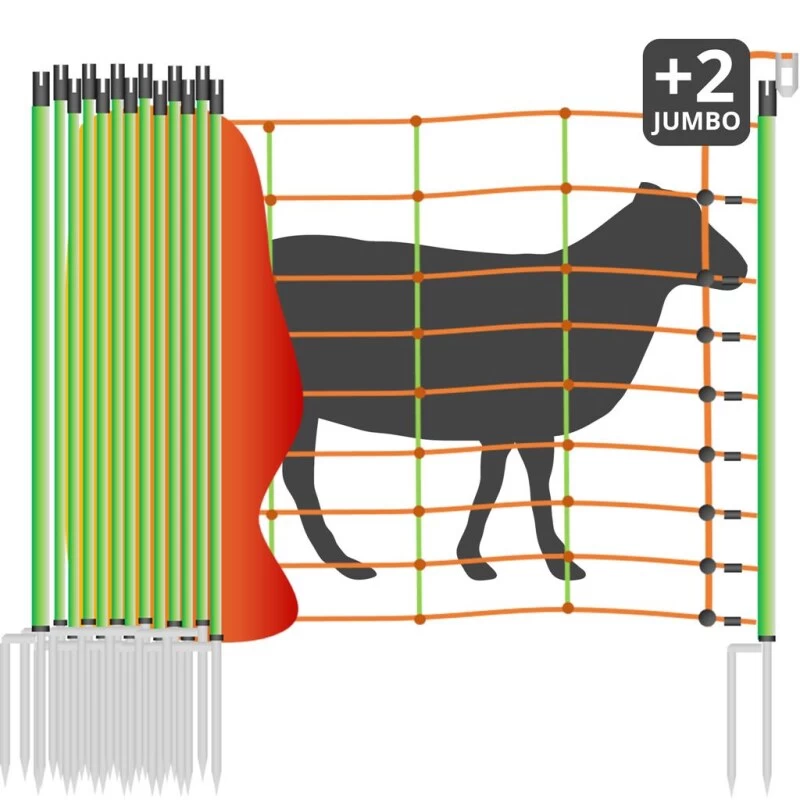 Der Schafzaun »Euronetz« Elektrozaun ist 50m lang, hat 2 Spitzen und ist 90cm hoch. Die gewohnte Euro-Netz Qualität können Sie jetzt auch mit 19mm starken Doppelspitze-Pfählen (am Anfang und am Ende) beziehen. Das Netz erreicht dadurch eine noch bessere Standfestigkeit und lässt sich optimal spannen. KOMBI – mit den starren Senkrechten, 90 cm hoch, 50 m lang. 9 horizontale Kunststofflitzen, davon 8 mit eingearbeitetem Chromnickeldraht machen das Schutznetz zum Elektrozaun. Abstände der Litzen horizontal 6 x 10 cm, 2 x 15 cm sowie alle 30 cm in den Senkrechten – jeweils 14 Pfähle mit Doppelspitze. EINSATZBEREICH: Schafe, Lämmer, Ziegen. Obere Litze um 80% verstärkt, 24 Kunststoffmonofile Ø 0,40mm, 6 Edelstahldrähte Ø 0,20mm. Bodenlitze verstärkt, nicht stromführend 32 Kunststoffmonofile Ø 0,40mm. Restliche Litzen je 15 Kunststoffmonofile Ø 0,40mm, 3 Edelstahldrähte Ø 0,20mm. UV-stabilisiert. Jeder Maschenkreuzungspunkt mit Kunststoffplombe unlösbar verschweißt. Standfest auch bei hügeligem Gelände oder Bodenunebenheiten. Durch die starren Senkrechten kein durchhängen der Netze