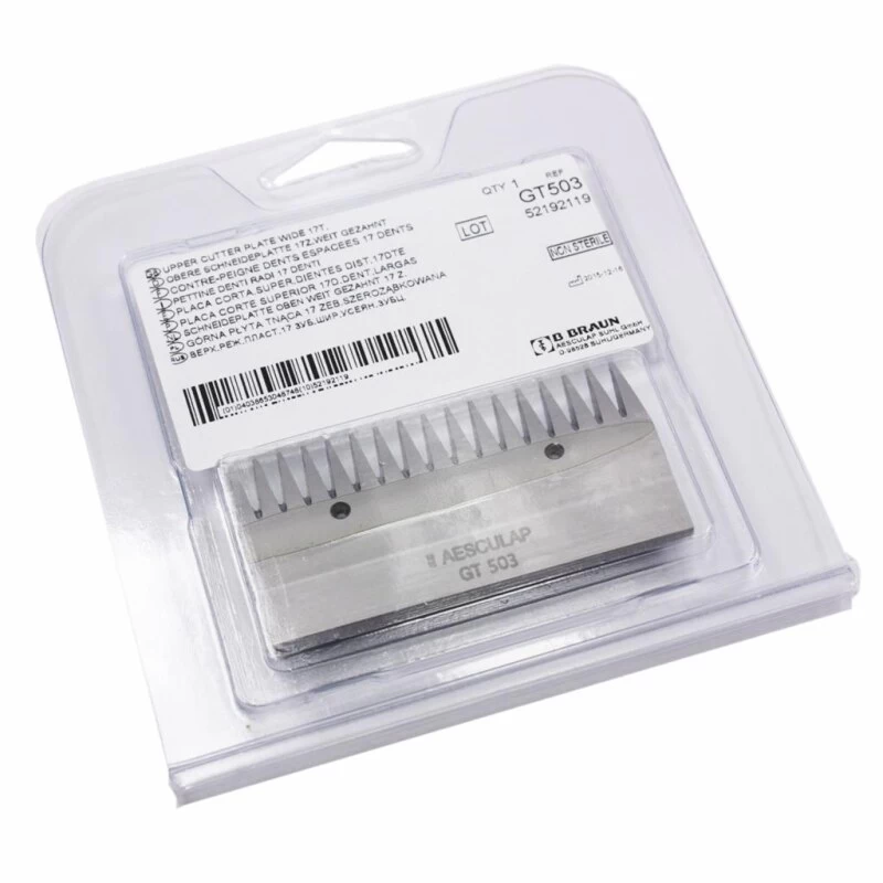 Der Scherkamm »Aesculap GT 503« (obere Schneidplatte 17 Zähne) ist geeignet für Rinder, feinwollige Schafe und Einzelschafe