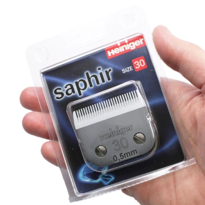 Die Scherköpfe »Heiniger Saphir 30« mit einer Schnitthöhe von 0,5mm ist für VET, Katze und Hund geeignet.