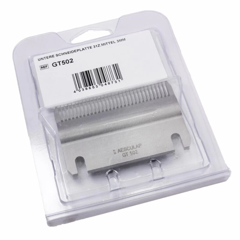 Der Scherkopf »Aesculap GT 502« mit einer Schnitthöhe von 3mm, mit einer unteren Schneidplatte mit 31 Zähnen ist geeignet für Rinder und Pferde
