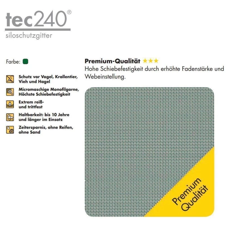 Das Siloschutzgitter »Safe« Profi Schutz für Silage in grüner Grundfarbe, Größen von 5x6m bis 10x25m, mit ca. 240 g/m² HD Polyethylene, zum Schutz der Abdeckfolien auf der Silage. Zill Siloschutzgitter vom Typ TEC 240 verhindern Schäden der Folie des Silos durch Einflüsse wie Vogel, Krallentier, Hagel oder Vieh und sichern dadurch die Qualität Ihrer Silo Anlagen. Neueste Maschinentechnik im Webebereich und innovative Weiterentwicklungen, sowie strenge Qualitätskontrolle machen Zill TEC 240 Siloschutzgitter zu einem TOP Produkt. Durch die extrem dichte und gleichmäßige Webung der Zill Siloschutznetze TEC 240 wird eine höchstmögliche Schiebefestigkeit erzielt. Mit einer maximierten UV-Stabilität und der hochwertigen Verarbeitung der Nähte und Säume sorgen die TEC 240 Siloschutzgitter für höchstmöglichen Schutz bei besonders langer Lebensdauer (bis zu 10 Jahren und mehr). Die Gitter für Silagen haben eine windbrechende Wirkung und verhindern so das Flattern und Aufpumpen der Silo-Folie. Dadurch wird ein nachträglicher Lufteintritt und damit Schimmel und Verlust von Futter unterbunden. In moderne Siloabdeckungen sind Zill Siloschutznetzen vom Type TEC240 unverzichtbar und bieten nachhaltig und wiederverwendbar Schutz.