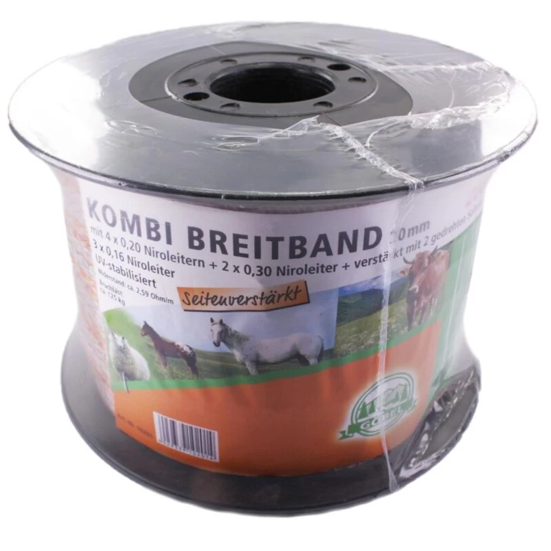 Das Weidezaunband »Combi« Breitband ist 20mm breit und 200m lang. Seitenverstärkt ist das Combi Weidezaunband und mit 4×0,20 Niroleiter, 2×0,30 Niroleiter verstärkt mit 2 gedrehten Seitenlitzen 3×0,16 Niroleiter sehr leitfähig ausgestattet. Das Weidezaunband hat einen elektrischen Widerstand von: 2,59 Ohm/m. Die Bruchlast des Weidezaunbands liegt bei: 125 kg.