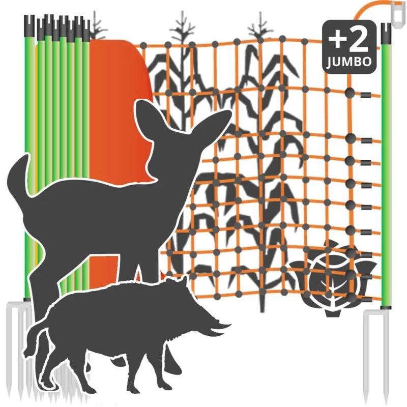 Das Wildabwehrnetz »Euro Netz« für Wildschutz & Wildschweinabwehr ist 25m lang, hat 2 Spitzen und ist 65cm hoch. Die gewohnte Euro-Netz Qualität können Sie jetzt auch mit 19mm starken Doppelspitze-Pfählen (am Anfang und am Ende) beim Wildabwehrnetz beziehen. Das Netz erreicht dadurch eine noch bessere Standfestigkeit und lässt sich optimal spannen. Mit extra kleiner Maschenweite 65cm hoch, 25m lang, 10 horizontale Kunststofflitzen, davon 9 mit eingearbeitetem Chromnickeldraht. 9 Pfähle mit Doppelspitze. Euro-Netze sind flexibel, da Unebenheiten mit extra Pfählen und Heringen ausgeglichen werden können. Bodenlitze verstärkt, 32 Kunststoffmonofile Ø 0,40mm, nicht stromführend. Restliche Litzen je 15 Kunststoffmonofile Ø 0,40mm, 3 Edelstahldrähte Ø 0,20mm. Die Senkrechten je 15 Kunststoffmonofile Ø 0,40 mm. UV-stabilisiert ist das Euro Netz Wildabwehrnetz und jeder Maschenkreuzungspunkt mit Kunststoffplombe unlösbar verschweißt.